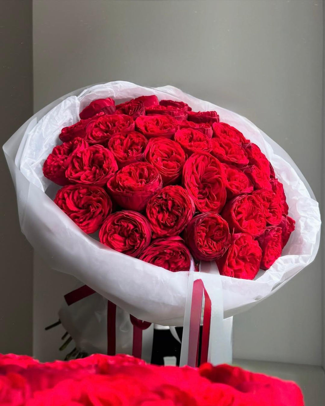 Our Sofia bouquet is a show-stopping symphony of velvety red garden roses, wrapped in crisp white paper and finished with a satin ribbon for that perfect touch of drama.